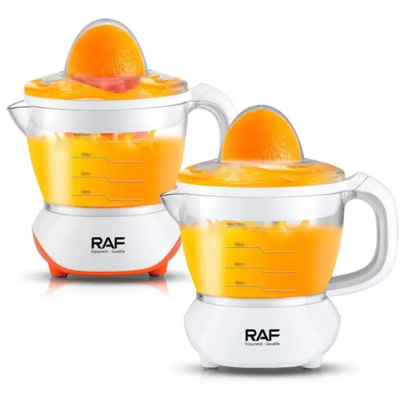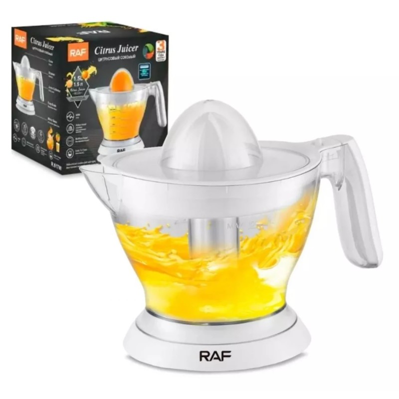 RAF electric citrus juicer designed for fast aur fresh juice extraction. Compact, powerful aur easy to use, perfect for daily household use.