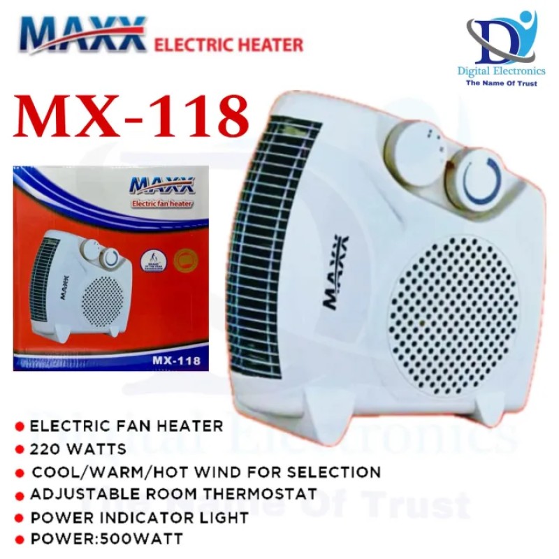 Introducing the MAXX Electric Fan Heater (MX-116), the perfect solution for keeping your room warm and cozy during the colder months. With its overheat control feature, you can rest easy knowing that your safety is a top priority. This heater is designed to heat up rooms up to 240 SqFt, making it ideal for small to medium-sized spaces. Its sleek design and compact size make it easy to move from room to room, while its powerful heating element ensures that you stay warm and comfortable. Whether you're looking to heat up your bedroom, living room, or office, the MAXX Electric Fan Heater (MX-116) is the perfect choice.